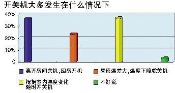 离开房间关机,回房开机昼夜温差大,温度下降就关机根据室内温度变化随时开关机不好说