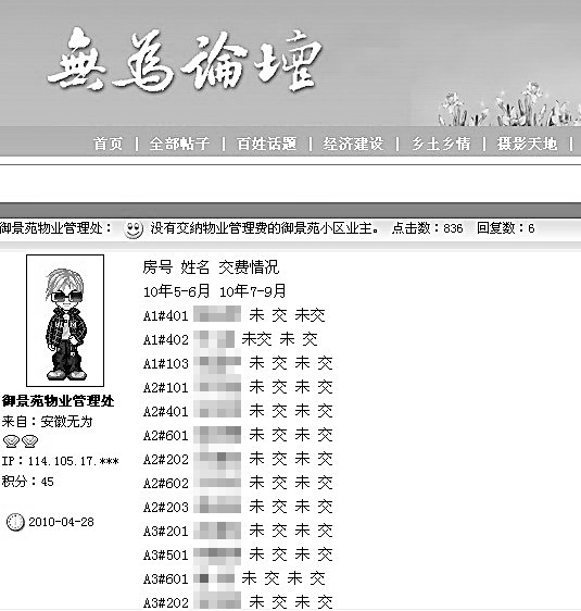 11月上旬,一篇名为《没有缴纳物业管理费的御景苑小区业主》的帖子发布在无为县县政府的网络论坛上。该帖不仅指名道姓,贴出业主未缴物业费的时间,甚至还明确标出业主所住单元及房号等信息。记者细细数了一下,从该小区1号楼至18号楼,共有上百名“欠账”业主被曝光(如图所示)。