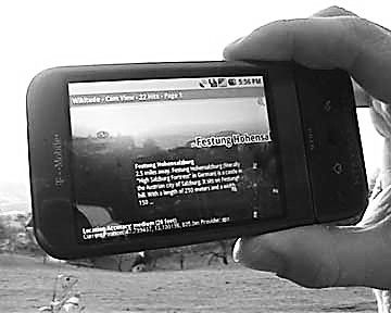 去年夏天,苹果在iPhone3GS上实现了手机扩增实境功能。这个应用是将开发商 AcrossAir的 NearestTube软件,与iPhone3GS上的GPS、指南针、拍照功能整合,构成一个实时地铁信息系统。用户只要把手机的相机对准周围景物,屏幕上就会自动出现地铁站的方向和距离等信息。这个位置服务显然比传统的电脑和手机位置查询都更方便。设想一下,在手机上打开GPS或者AGPS进行定位后,通过手机内置的数字罗盘,并连接上地图服务器,就可以确定你手机摄像头所指向前方的建筑物名称,而摄像头的功能就是把虚拟的位置和现实世界联系起来。