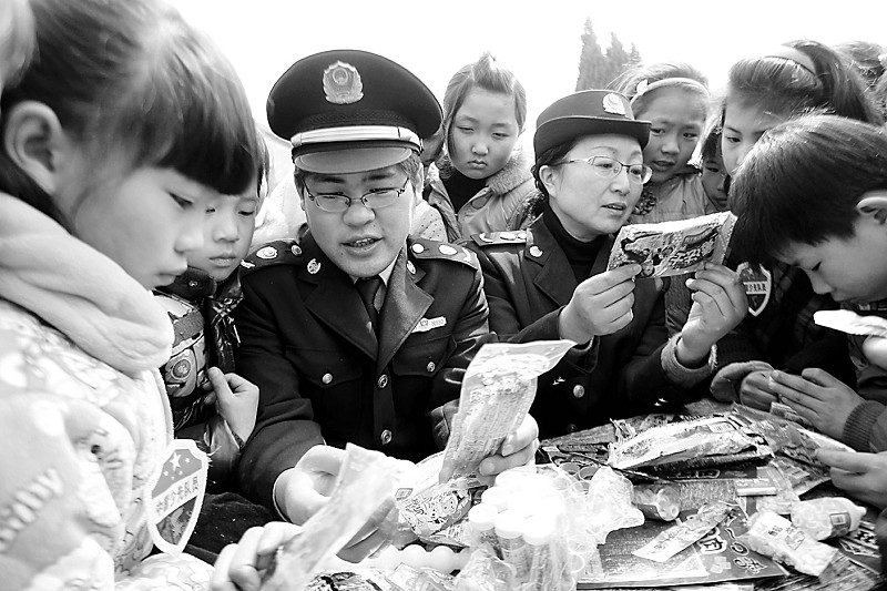 近日,安徽省淮北市工商局组织工商执法人员到该市部分农村学校开展了消费维权进校园活动。活动期间,工商执法人员为学生发放了3·15维权手册,并耐心细致地讲解了消费维权、识假辩假等知识。此次活动的举办,增强了学生的自我防护意识和消费维权知识,受到了学生和家长的欢迎。图为工商执法人员在淮北市高岳镇小学为学生讲解如何辨别伪劣食品时的情景。 本报记者 洪敬谱/摄(本版图片除署名外均为资料图片)