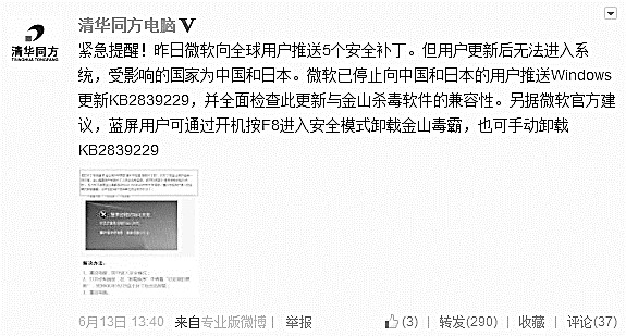 据媒体报道,在2013年6月12日微软打补丁日时,由于金山在自己的软件驱动中静默植入了暴力挂钩系统内核等程序,存在严重缺陷,会导致电脑发生蓝屏事故。当天,金山日本公司发布紧急公告向日本用户道歉,而一天后,由于微软发布了蓝屏的风险提示公告,金山公司迫于用户和舆论压力也不得不向中国用户发出致歉声明,但由于采取行动迟缓,已导致数百万用户的电脑蓝屏,损失已经不可挽回。