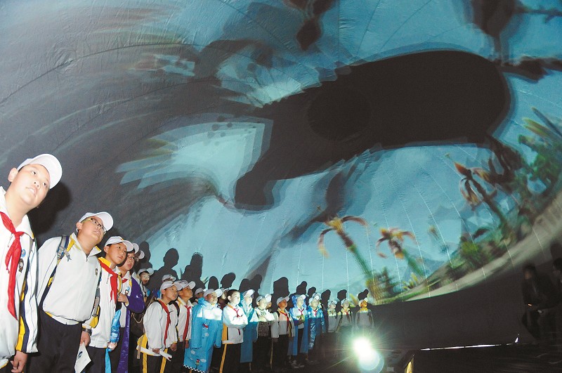 5月20日,2014年黑龙江省暨哈尔滨市科技活动周·流动科技馆进龙江启动仪式,在龙塔广场举行。本届科技活动周围绕“科学生活·创新园梦”主题,大力宣传空气质量、食品安全、应急避险等热点问题,普及科学知识和技术方法,提高公众科学素质。图为来自北京的流动天文馆正在播放天文科普影片。asianewsphoto/刘洋
