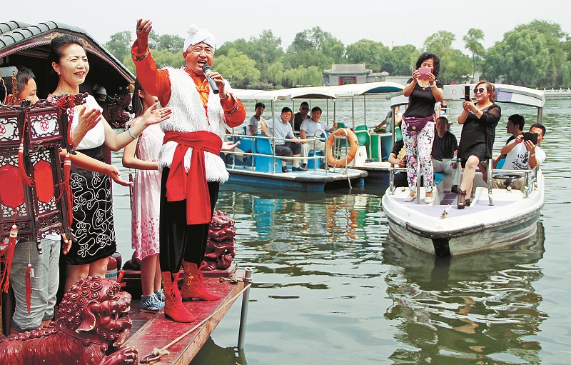 “七一”前夕,北京市什刹海野鸭岛码头的一艘游船上,传出一曲曲经典革命歌曲,优美的歌声吸引居民和游客加入到演唱者的行列中。演唱者武国举作为中国红色文化传播形象大使,与什刹海街道后海西沿社区数百名居民齐声歌唱《没有共产党就没有新中国》、《山丹丹花开红艳艳》、《绣金匾》等经典革命歌曲。在激荡人心的旋律中,人们仿佛又回到那个火红的年代。本报记者郝军摄影报道