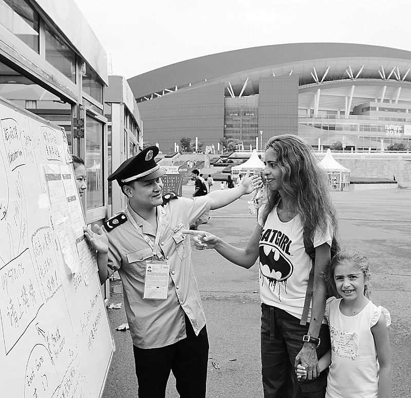图2:南京市工商局建邺分局工作人员在青奥会场馆内热情服务。