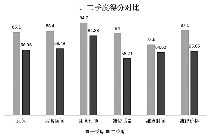 以本次满意度得分最高的店内和服务设施为例,比一季度得分降低高达12.82分。而在维修质量方面,前者比后者低了足足有25.79分。售后满意度总体得分不高也在情理之中。