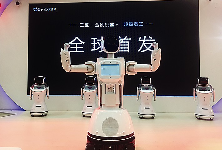 除了现场展示,三宝机器人还在展馆内开设了一家便利店,店门口有机器人值守,只要用手机微信扫一扫机器人身上的二维码,就可获得电子优惠券。进店后,可自行选购商品,不过收银等环节是由机器人来完成的,它们的服务贯穿于交易全程。