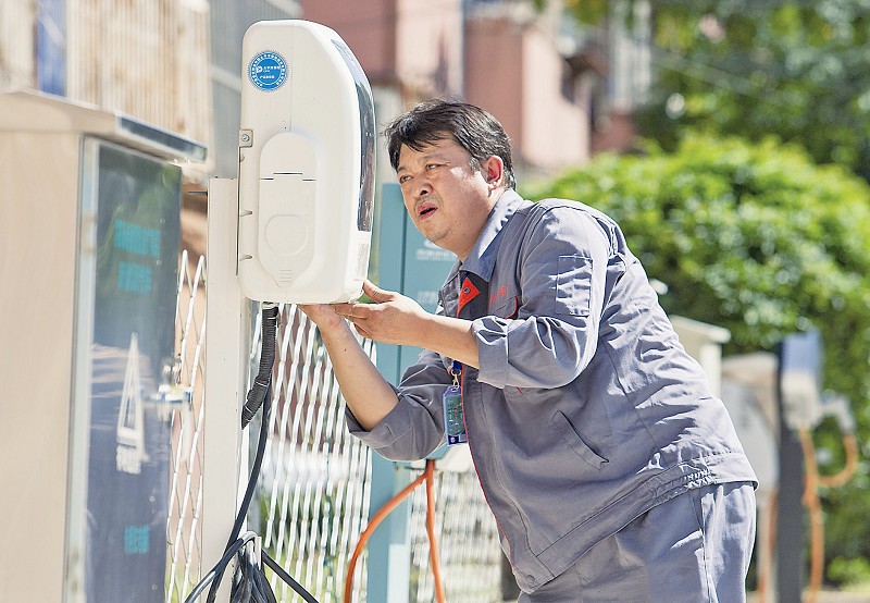 9月5日,北京城市副中心老华龙小区,龙旺同心物业公司的工作人员在安装电动车充电桩。 该小区建于1993年,有3100户居民。随着电动车的普及,小区内购买电动车的居民越来越多,充电桩就变得“一桩难求”。为此,小区物业开辟了专门区域,安装了12个充电桩,供居民使用。 据记者了解,未来物业公司还将对小区的电力设施进行改造,改造后可接入和大型充电站同样的电路,满足电动车充电需求。本报记者郝军摄影报道