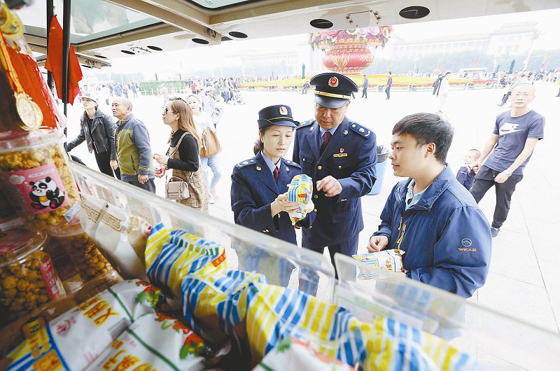 图一:执法人员查看天安门广场便利车上销售商品的标签。