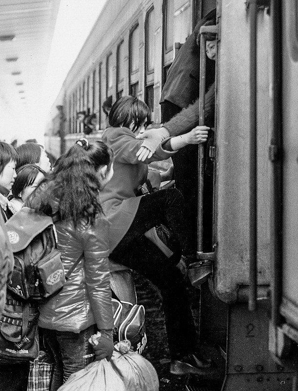 图一:2000年2月20日,春节过后,大批年轻人在安徽省阜阳市火车站乘车返城务工。