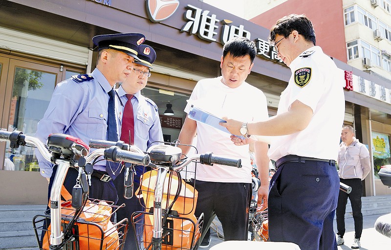连日来,北京市石景山区市场监管局执法人员对辖区电动自行车销售主体进行专项检查,检查经营主体的经营资质和进货验收制度落实情况,要求商户加强证照和进销货票据管理;对电动自行车强制性国家标准《电动自行车安全技术规范(GB17761-2018)》执行情况进行逐户检查,对不合格商品现场责令下架停止销售;现场开展行政指导,督促经营主体加强自律,健全消费纠纷处理机制。执法人员还就电动自行车强制性国家标准和北京市地方相关政策向商户进行了普法宣传。图为检查现场。本报记者董芳忠摄影报道