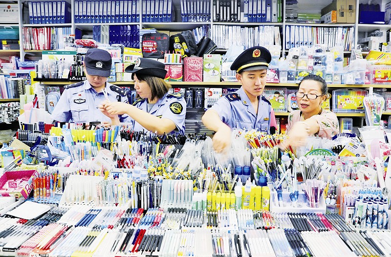 为净化校园周边经营环境,日前,北京市石景山区市场监管局联合公安部门,在辖区范围内开展校园周边文具、小食品专项整治行动。执法人员对辖区所有学校周边相关经营主体进行了证照排查,并查验校园及周边食品生产者、经营者的主体资格和进销货台账制度落实情况,督促其亮照经营、依法落实商品质量主体责任。本报记者董芳忠摄影报道