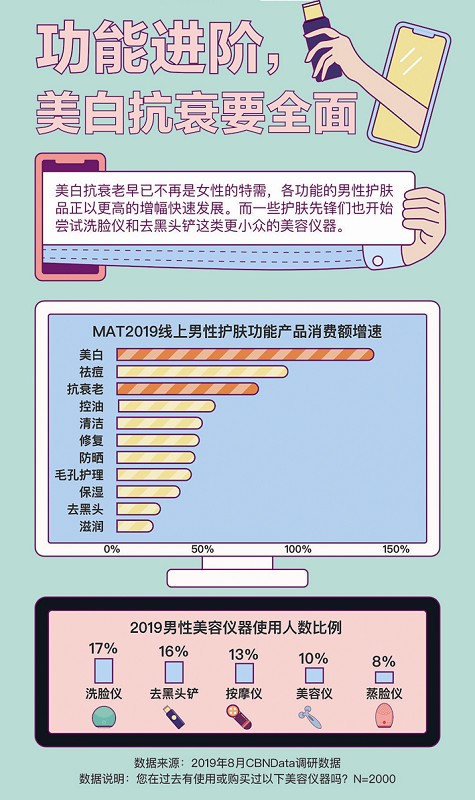 当下,不论是娱乐圈的男艺人,还是活跃在社交媒体的男性美妆博主,都在暗示着更精致优雅的男性形象。数据显示,近九成的男性表示护肤应该作为日常护理来对待,他们会自主地去选购符合自己需求的护肤产品,引领潮流的男性消费者甚至开始尝试洗脸仪和去黑头铲这类更小众的美容仪器,洗脸仪消费持续升温。