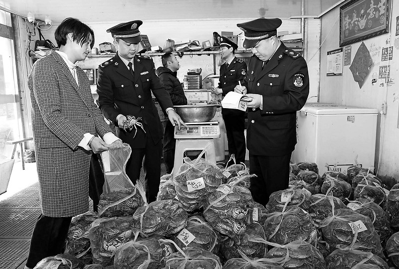 日前,江苏省兴化市市场监管局开展螃蟹海鲜市场专项督导检查,加强辖区水产品监管,规范水产品经营秩序。检查中,执法人员要求经营户对螃蟹价格进行明码公示,杜绝使用不符合食品安全标准的物质对螃蟹进行清洗,保障消费者合法权益不受侵害。图为检查现场。仲昭月 本报记者董芳忠摄影报道