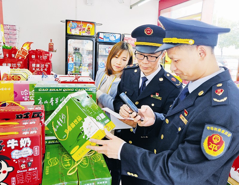 近日,江西省于都县市场监管局组织执法人员,对辖区内商场超市的商品条码进行了监督检查。在现场,执法人员使用条码扫描终端,对商场超市内销售的牛奶、冷饮、零食和熟肉制品等10余类80多件商品进行了检查,核对商品条码是否在有效期内,是否存在冒用他人条码的现象,并检查了进口商品是否具有中文标识等。王雨林 康有华摄影报道