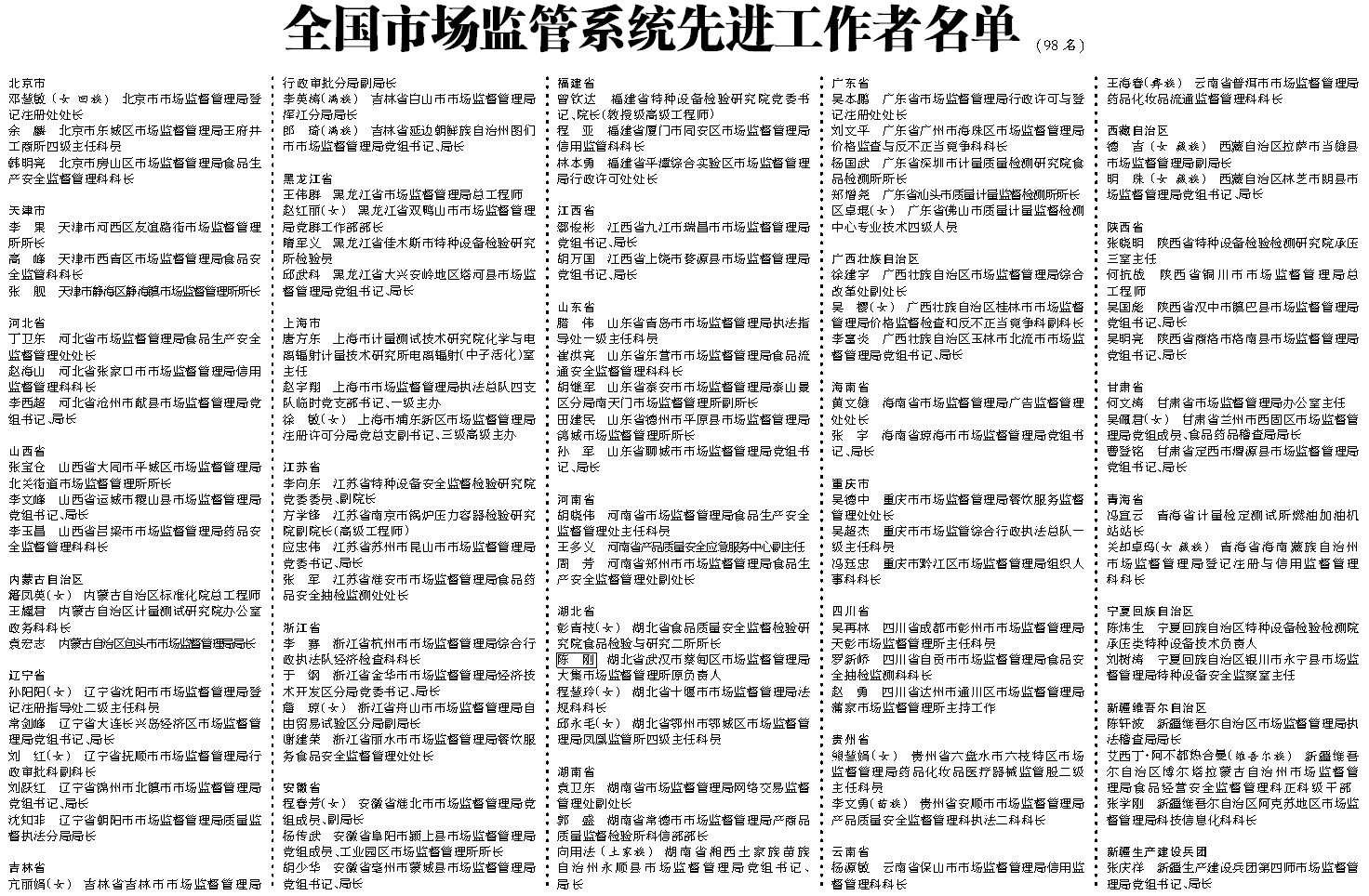 ·全国市场监管系统先进工作者名单(98名)