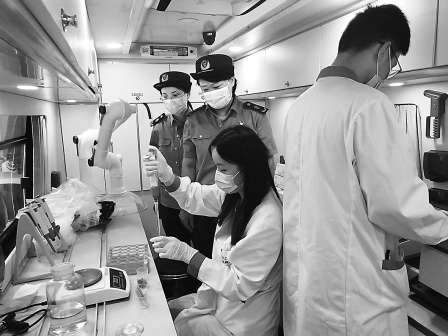 图二:由食品科、食药所党员组成的流动食品安全检测突击队正在快检车上对蔬菜进行快检。