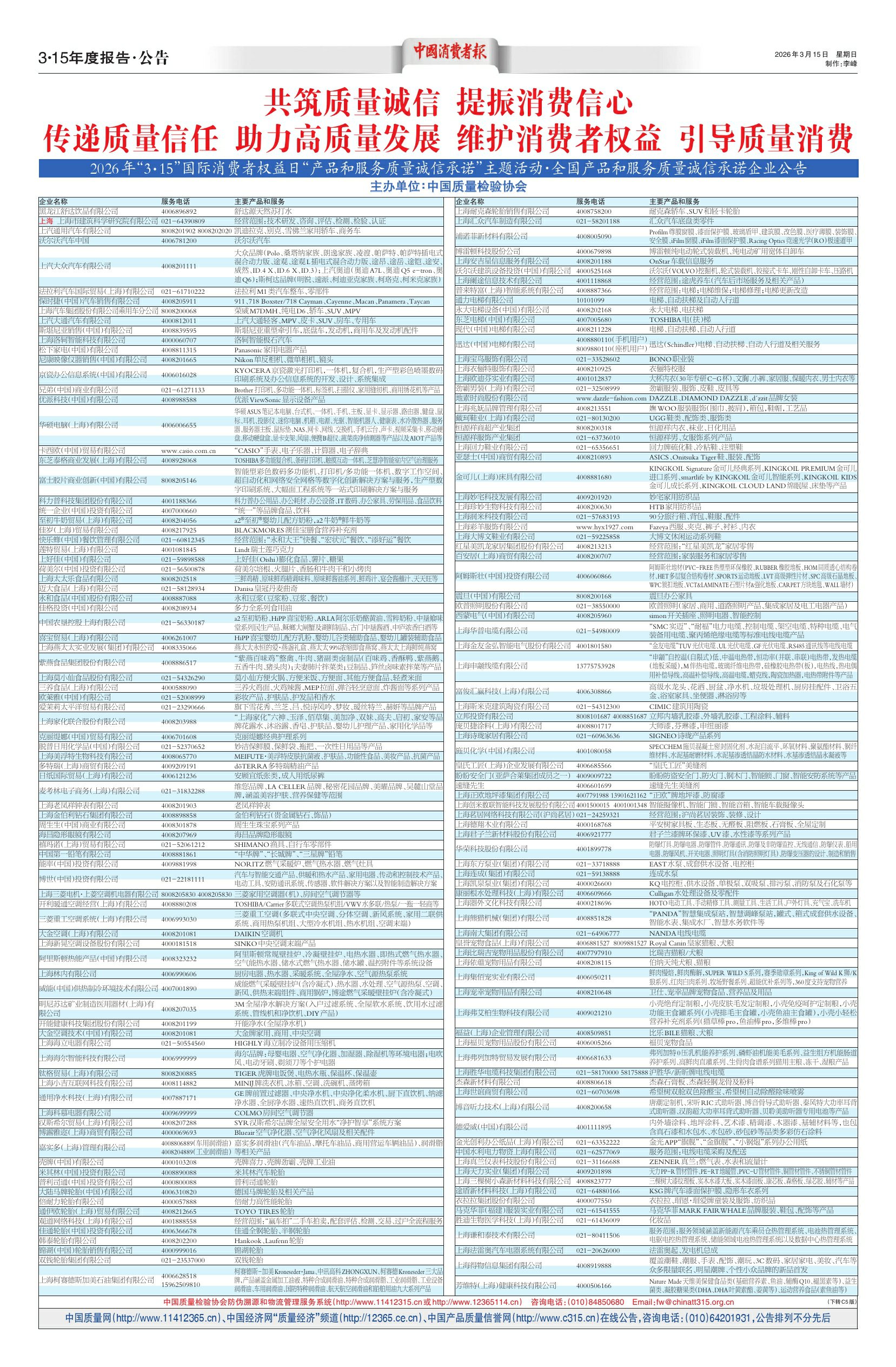 2026年“3·15”国际消费者权益日“产品和服务质量诚信承诺”主题活动·全国产品和服务质量诚信承诺企业公告