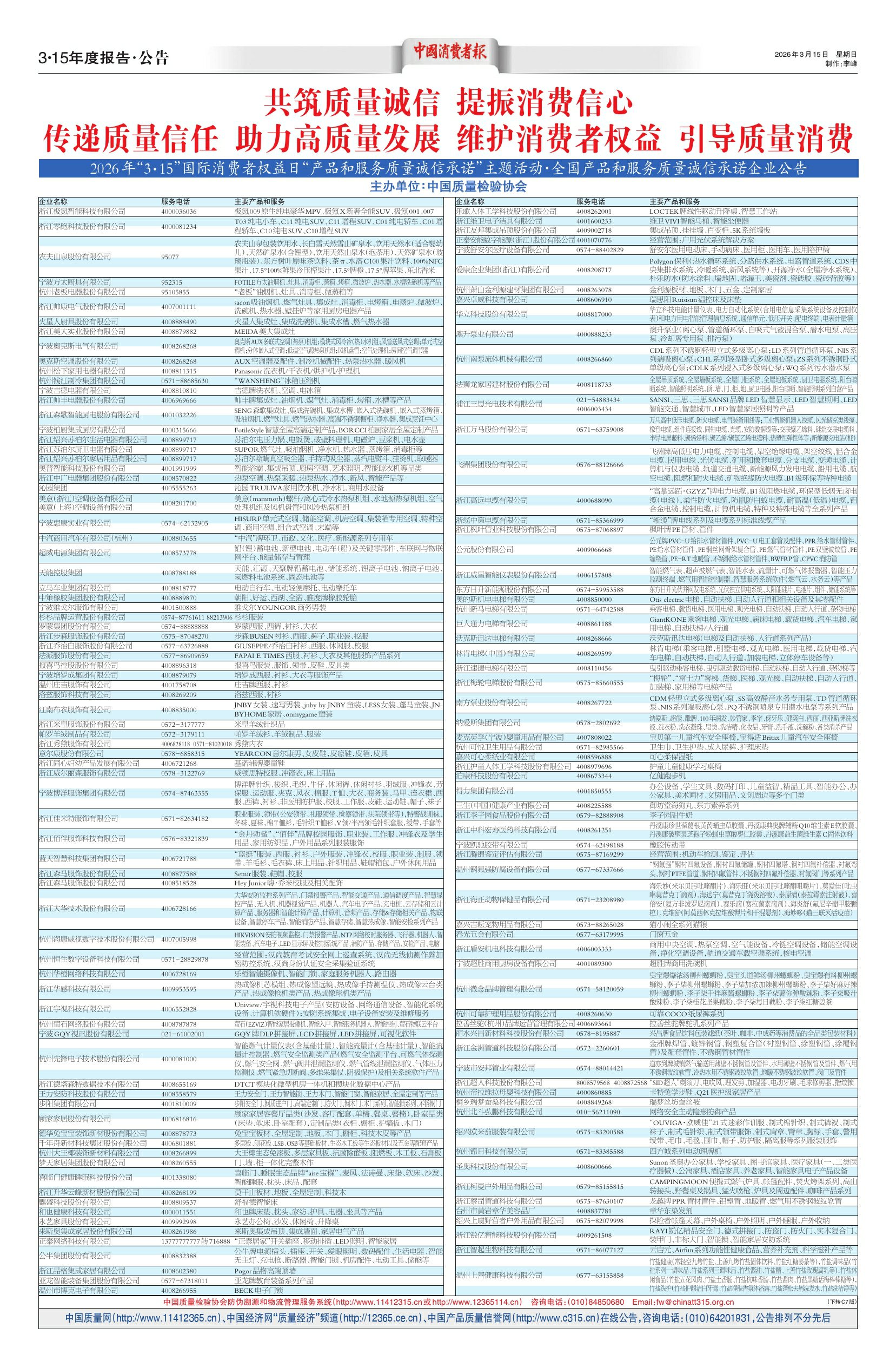 2026年“3·15”国际消费者权益日“产品和服务质量诚信承诺”主题活动·全国产品和服务质量诚信承诺企业公告