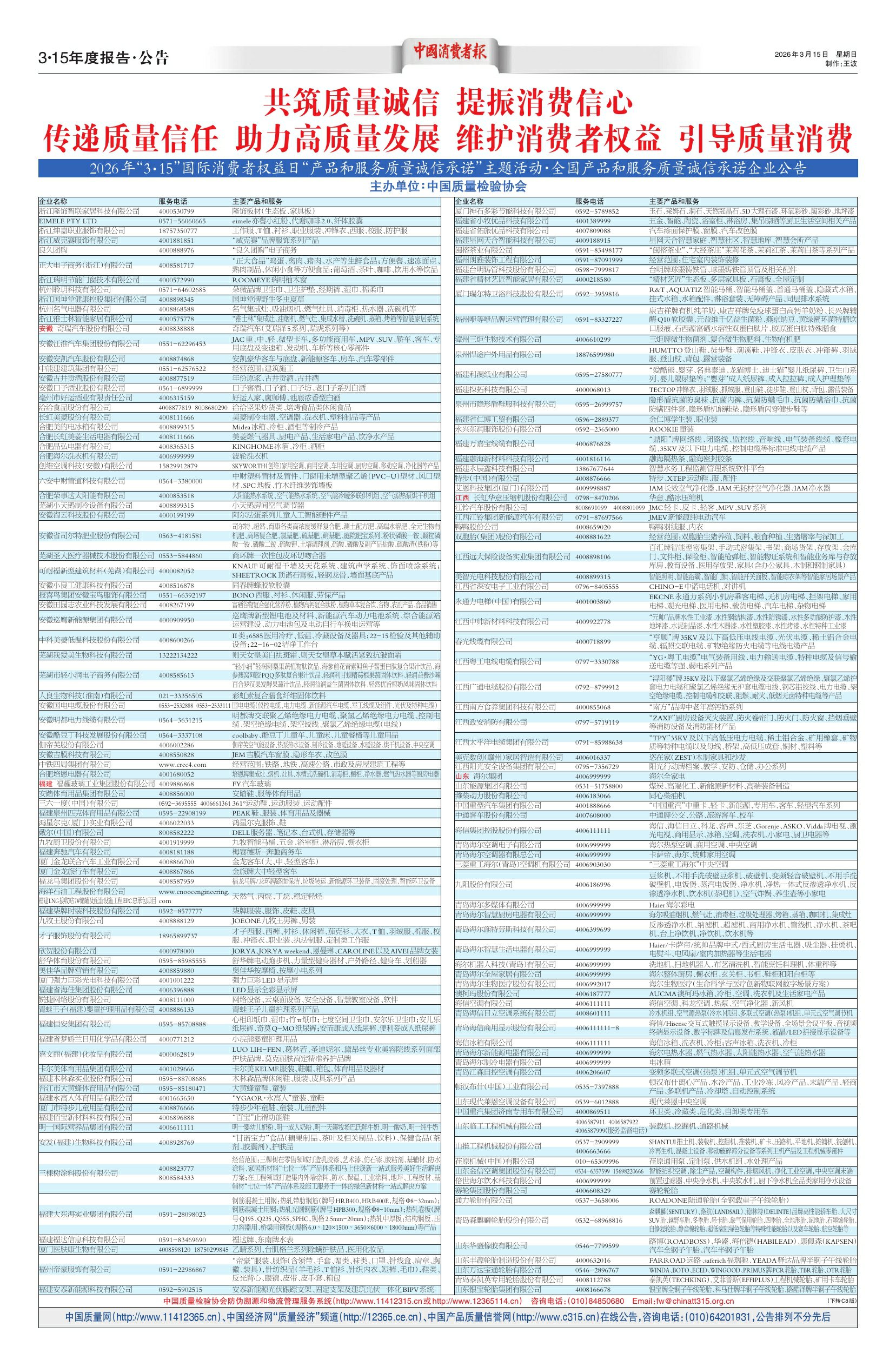 2026年“3·15”国际消费者权益日“产品和服务质量诚信承诺”主题活动·全国产品和服务质量诚信承诺企业公告