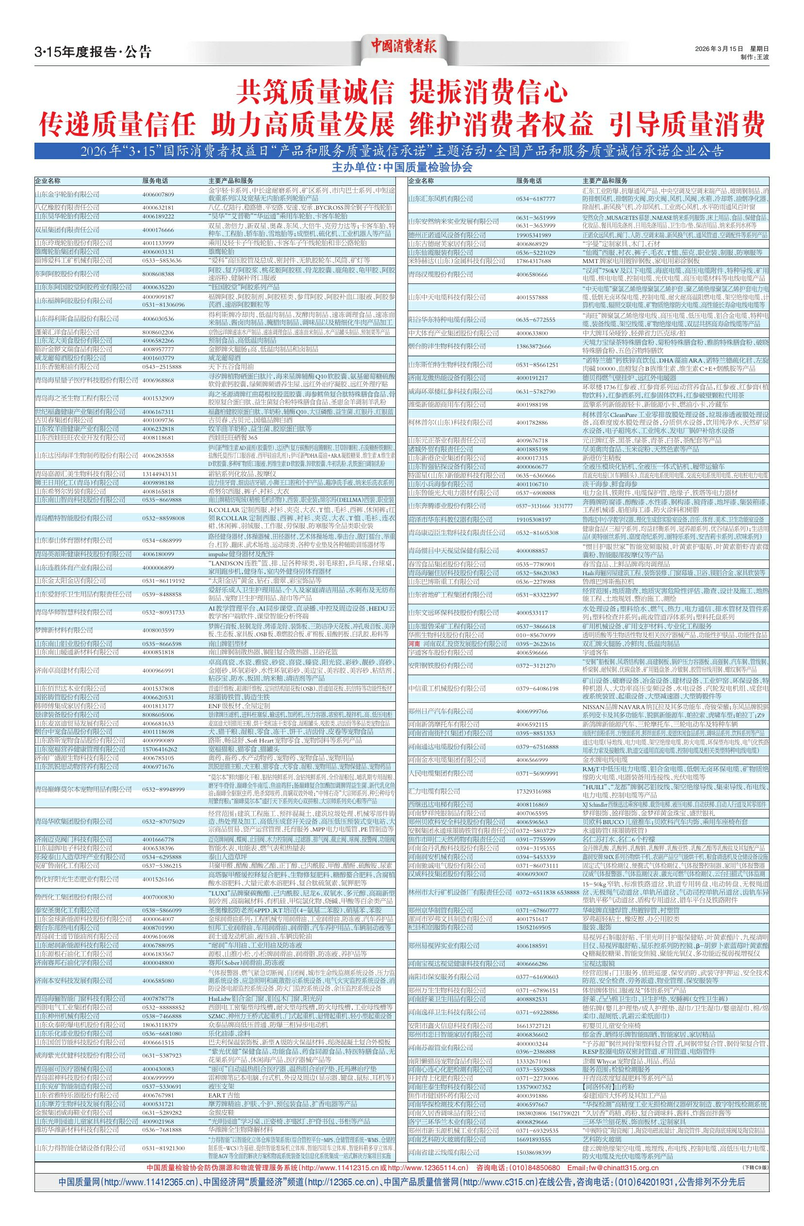 2026年“3·15”国际消费者权益日“产品和服务质量诚信承诺”主题活动·全国产品和服务质量诚信承诺企业公告